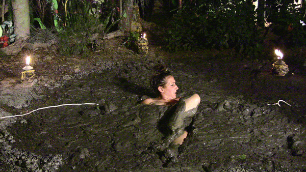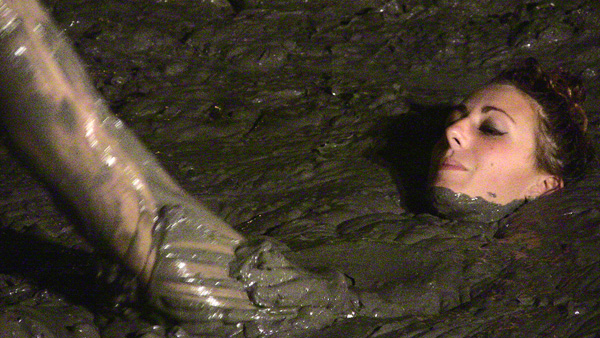 For reasons undisclosed Elvira is the victim of a primitive execution. After being made to stand on a platform with her back to a pit of quicksand, some words of mumbo jumbo are spoken by the tribal execution, after which her sarong is pulled away. After some more words her arms are pulled out to the side by ropes, and after a few more the ropes are used to force her to fall backwards into the mire. She is frightened and disgusted at first but that only lasts a minute or so. After that she becomes aroused and increasingly so as the mire pulls her deeper.