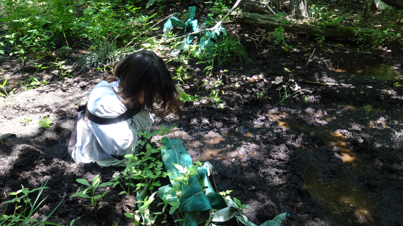 Stefani is poaching blackberries from a nearby property owner. From time to time she also poaches rabbits and who-knows-what-else. Suddenly she hears the report from a shotgun, not too far away. She flees. There are several more shotgun blasts as she flees. Then she falls into a quick clay bog. She tries using her bandana to reach for something but its no use. She cannot use her top because she lost that long before she got to the quicksand.