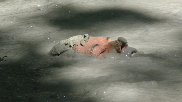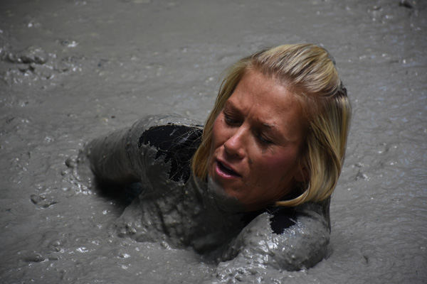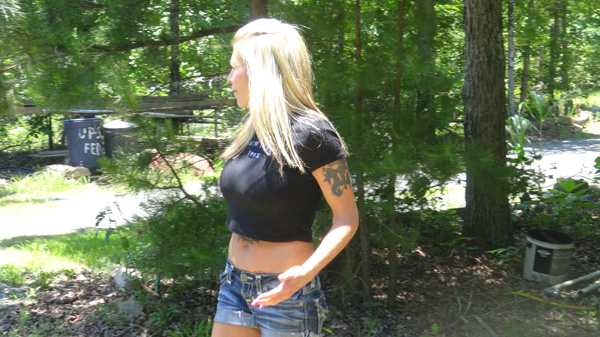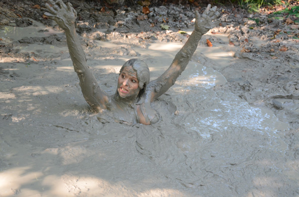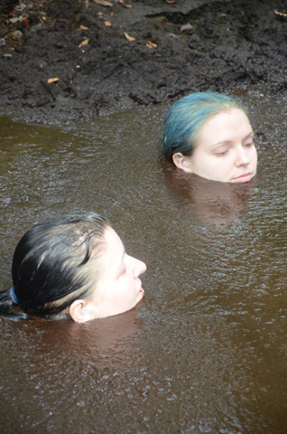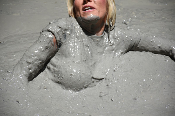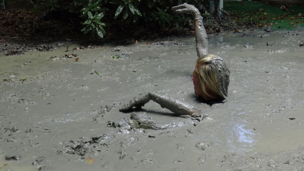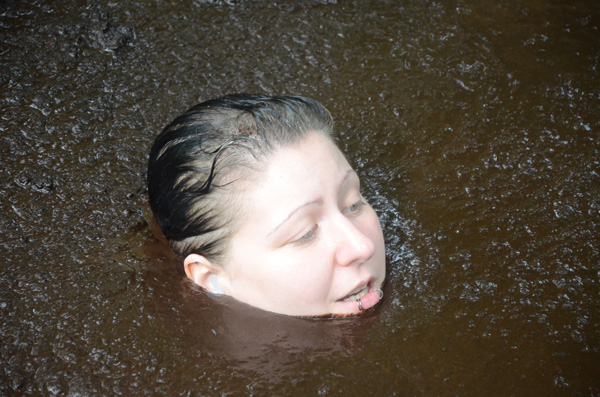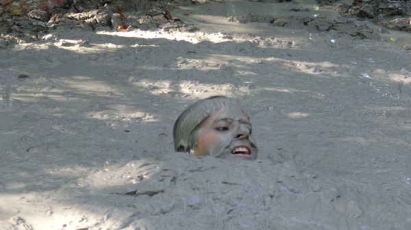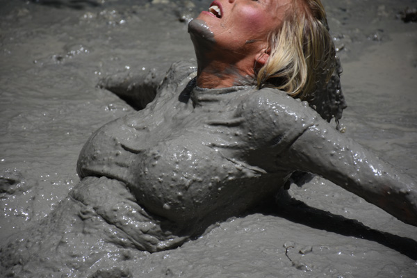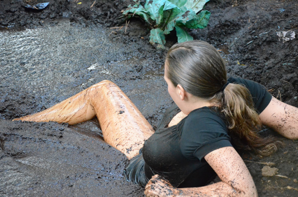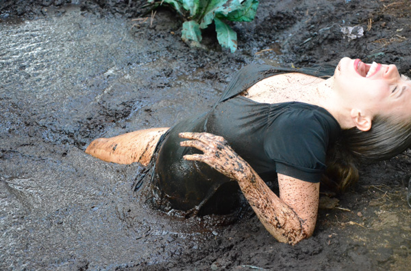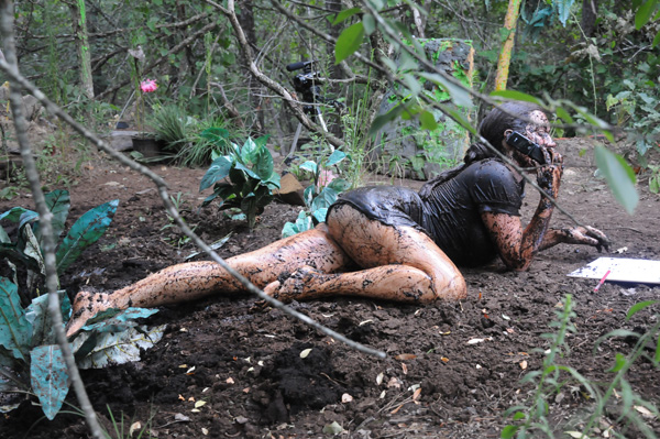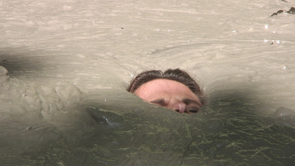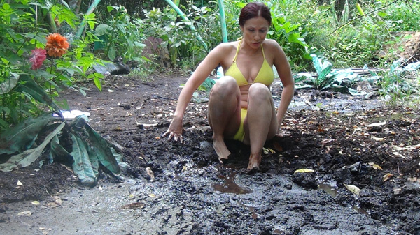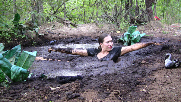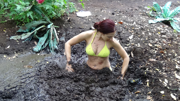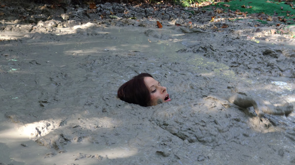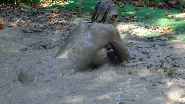 Stefani is a contestant on a 'reality' show where she is nearly naked and alone in the wilderness. Being pestered by biting insects she mentions to herself that it would be helpful to find some mud to coat her skin with as a bug repellent. Shortly after that she encounters a clay pit, but accidentally falls in. At first she is terrified as she rapidly sinks to her neck. The fear changes to frustration when she realizes she has stopped sinking but is stuck. Then she learns how to get in-stuck and crawls out. Then she gets back in when the bugs return. Things get better and better and she even submerges herself several times before eventually climbing out to find some food. Your videographer might actually watch if the TV game shows were like this scene - after all its Stefani!