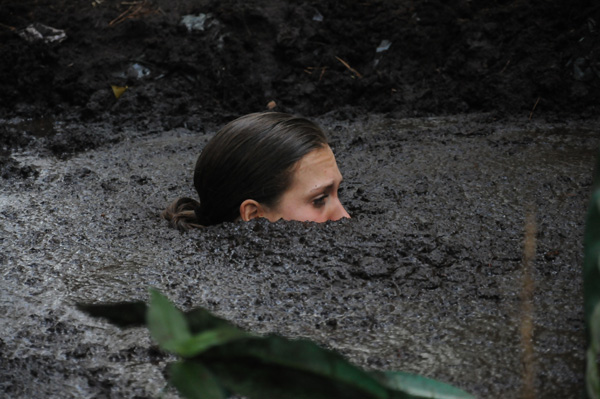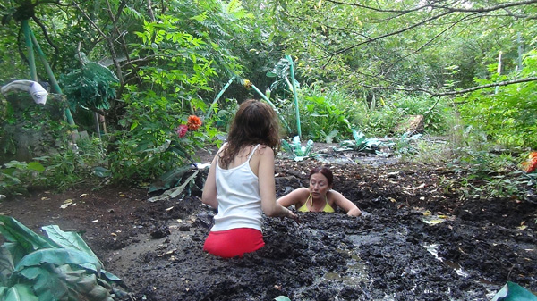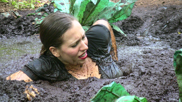 The tribe must have a new queen. Any woman may take the test and the first one to succeed inherits the throne. Nyssa is the first to make the attempt. She doesn't think much of the test, which is to enter a clay bog at one end and exit at the other. Nevertheless, she makes the attempt. She removes her shoes but not her dress and fails to make it. Stormy is next. She isn't too impressed by the test either but is smart enough to remove her dress before making the attempt. Stormy is now the queen. This scene features fairly lengthy sequences of both characters moving slowly toward the camera while quite deep.