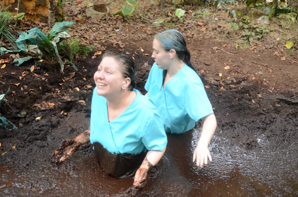 Alexia plays a typical, overbearing lifeguard at a country club and Jordana plays a member who does not seem to like authority, especially from lifeguards. At the start, Jordana is caught, by Alexia, in a area behind the pool area where she should not be and ordered out. As soon as Alexia is gone, however, Jordana comes right back. She wants to play in the mud bog. She does just that but suddenly sinks much deeper than expected and is stuck. Alexia finds her and enters the bog to try to perform a rescue. Soon they are both stuck. Eventually they call a truce and assist each other in getting out.