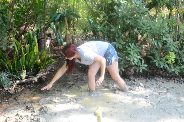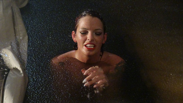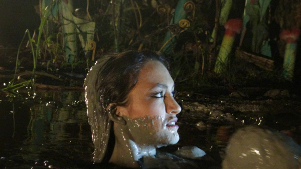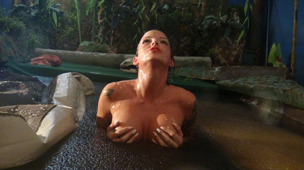 As the end of another successful shoot is celebrated over glasses of wine, Bella expresses her disappointment that the new pit was not quite ready and could not be used. After Fred agrees and expresses his own regret he calls it a night and goes to bed. Bella then decides she is NOT going to miss out on the new pit. What Fred doesn't know won't hurt him. She arrives with a towel and flashlight, strips to her bikini bottom, and gets in. She has quite a lengthy wallow, accompanied by a concert of tree frogs and other swamp night life and finds it quite stimulating. Toward the end the frog concert ends and after a few seconds it is apparent that a thunderstorm is approaching.