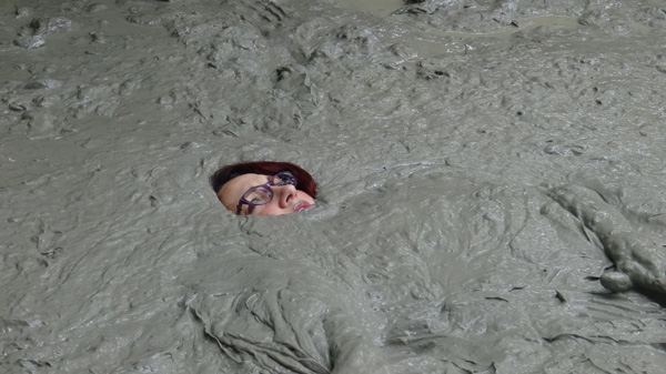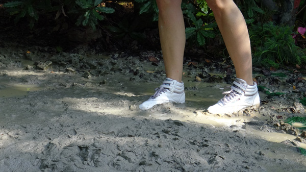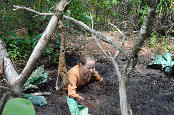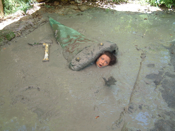 Angelique is searching for dinosaur bones. Her search ends when she spots one sticking up from a muddy place. The area has been marked off with yellow caution tape but that doesn't even slow her down. She works her way around the edges of the mud trying to get closer to the protruding bone but eventually slips in.She struggles with the bone, which is very stuck in the thick mud and eventually works it free, but ends up chest deep herself as a result. She then tries to get herself out but gradually just sinks deeper. It does not really dawn on her that she will be sinking under the surface until she is practically under the surface.