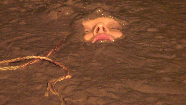 NormaGee wakes up to find herself with a rope around her chest and another rope to some overhead support. She is already chest deep in deep clay, although her exposed breasts are still above the surface. She goes through a variety of reactions, apparently having been drugged earlier. Eventually the rope breaks and she goes under, though in an aroused state. This scene was originally intended to be an episode of "Blowgun," but the initial blowgun attack was not filmed and the sinking begins further along than in the Blowgun series.