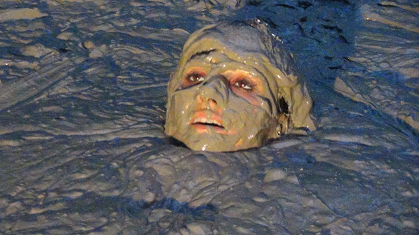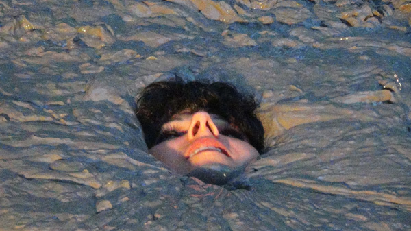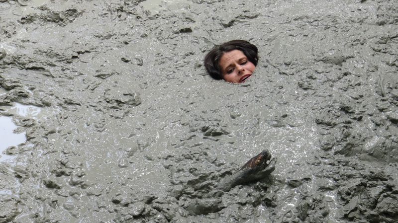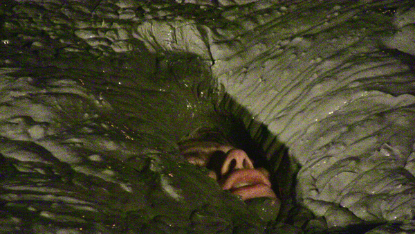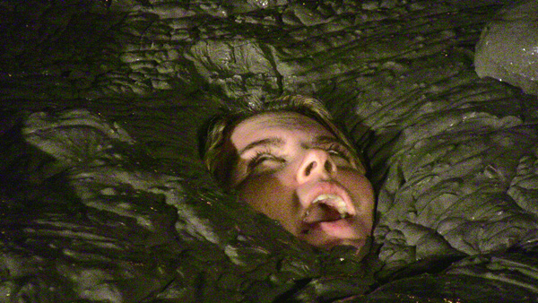 Rockelle is stripped of her top and forced to fall back into the quicksand in a jungle execution. Oddly, she seems to rather like the quicksand, although she looks a little actious as she is about to go under.