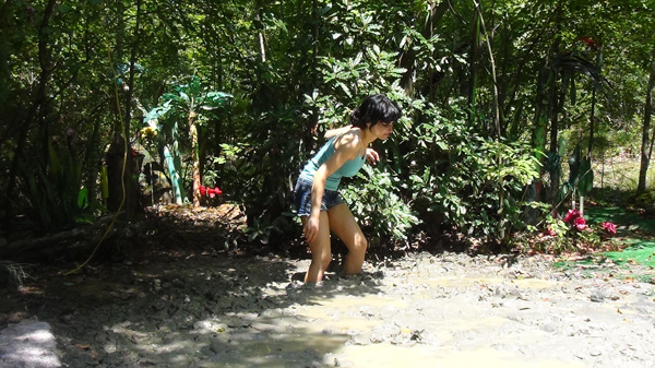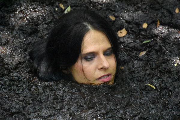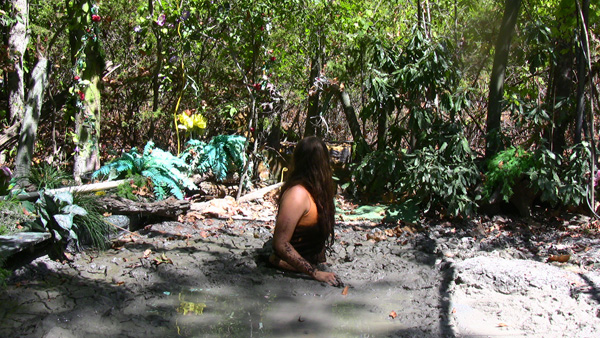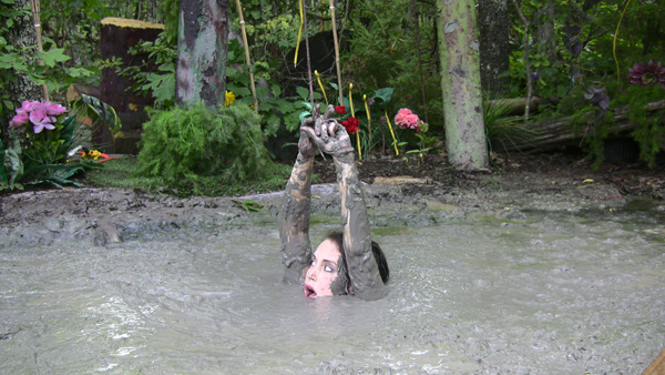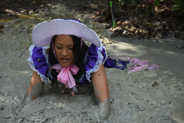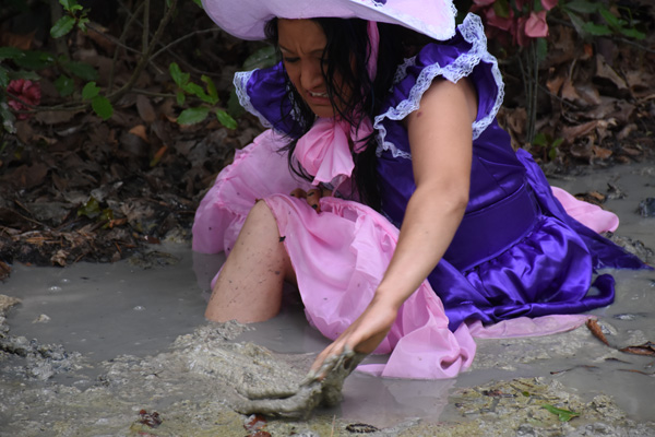 Karma plays a ditsy southern belle, dressed in a party dress from the 1840s. She heads out for a walk, demanding some pastry and a mint julip be ready when she returns. She nevr does return, of course, as quicksand intervenes. In the course of filming this scene we discovered that Karma is pretty good at doing a southern accent as well as playing a ditsy character.