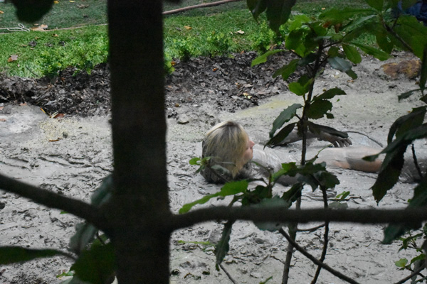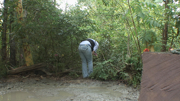 Office Norma is part of a team searching for a gun, apparently discarded by a perpetrator now under arrest. The team splits up, each assigned to a specific area of the forest.Searching some underbrush, with her back to a muddy wet spot she has not noticed (or at least recognized), her foot slips and she falls backwards into the gooey clay. Things turn out alright in the end, however, as the gun turns out to be eve more important than expected.