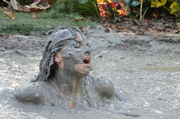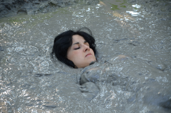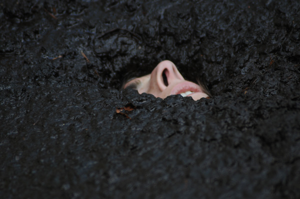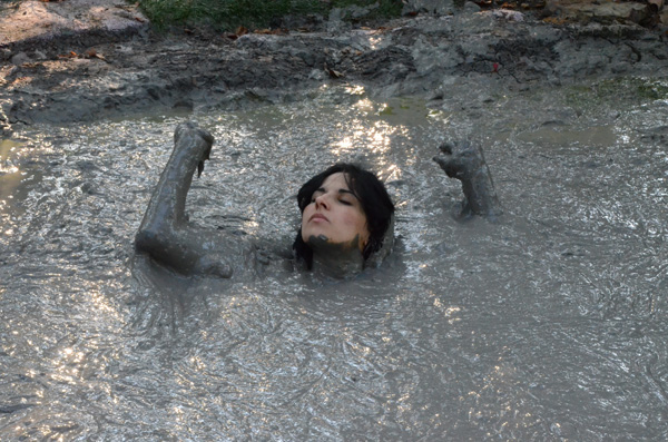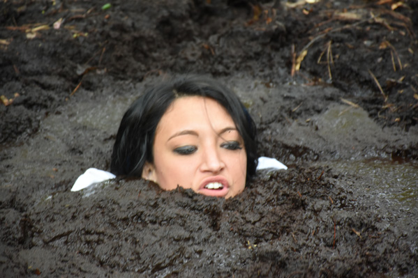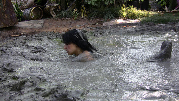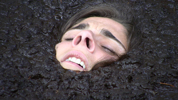 Bella performs a strip tease at the edge of a muddy spot in the forest. Then she complies with a request from her audience to enter the mud. That turns out to be a lot deeper than she though and she is soon stuck. With increasing panic she pleads for help as she slowly but steadily sinks. She goes all he way under, but then pops back up and crawls out.