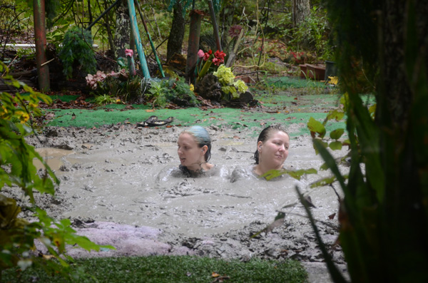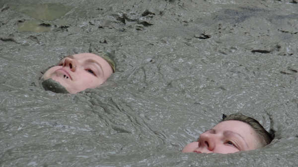 Bob and Magenta play a pair of extra-terrestrials who have beamed down to Earth for their vacation. While they look like human beings one key difference is their taste buds are in their feet and chests. On a previous visit, Bob got into a some serious trouble in a pizza restaurant for trying to taste the pizza with her feet. With their sandals oft they find many places on the ground that are delicious. Looking around they come to a wet spot. It tastes delicious; so good, in fact that they take off their tops and get in to get the full flavor of the rather deep mud. Gradually they sink deeper and deeper and are so overwhelmed they quite happily go al the way under.