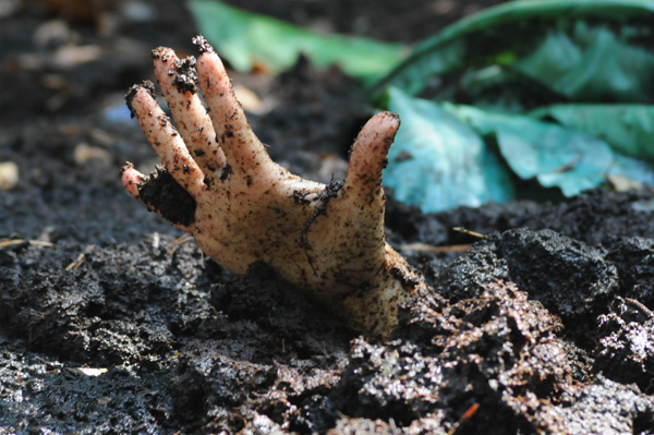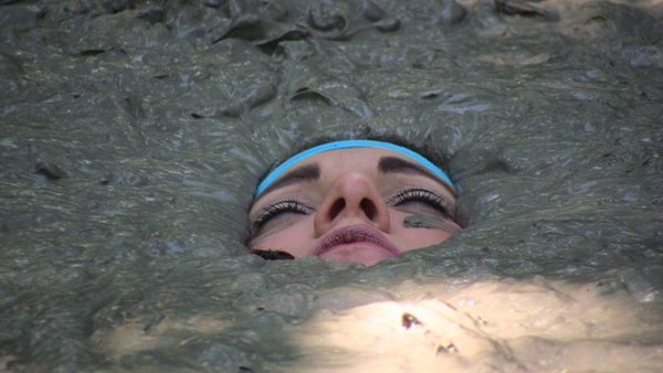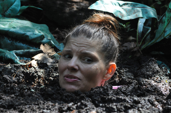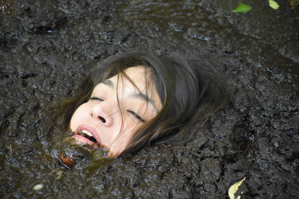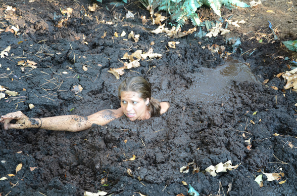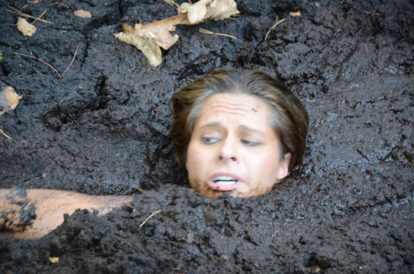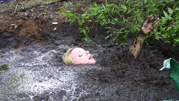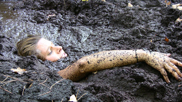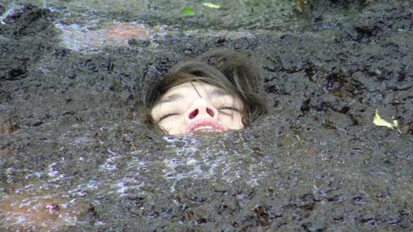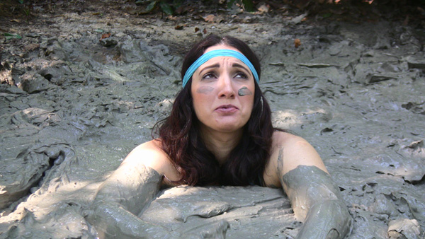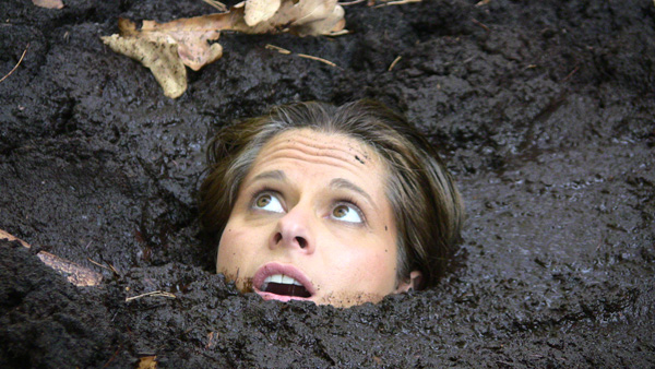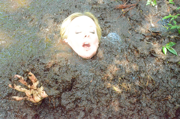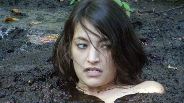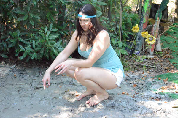 Angelique plays a nature lover, a rather extreme one, out gathering evidence, or at least what she thinks is evidence of illegal fracking by unscrupulous corporations. When she finds an area of wet clay she figures she has fund where the oil dripping is taking place and tries to find the drill, which must be under the mud somewhere. Eventually she is in the mud herself and quite stuck. She never does panic, however, being quite willing to become fertilizer for the surrounding trees.