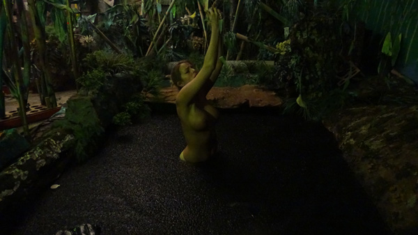 Bella plays a jungle explorer, complete with safari hat. Just what she is doing out in the untamed jungle at night and alone is unexplained. Just a few seconds after the scene opens, however, she is hit by a poisoned blow gun dart. She passes out. When she wakes up, though very groggy, she has been stripped to the waist and is suspended by her wrists, calf-deep in a jungle pit of Gallium Polykryptonite quicksand. She sinks slowly as the overhead vines stretch, going back and forth between fear and arousal, due to the poison. Eventually she sinks all the way under.