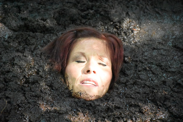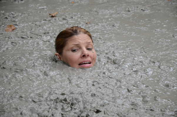 Angelique runs a cosmetic clinic and knows her rival has been using a unique new material for mud facials. She also knows her rival is getting the material from somewhere in a certain forest. As the scene opens, Angelique is searching through the forest for her rival's secret. Eventually she discovers a large pit filled with some sort of clay. She begins filling a small bottle with samples. She falls in awkwardly. At first she experiences no fear and merely sees falling in as a way to get samples from different parts of the pit. But after the sample bottle is filled, she realizes she is quite stuck. And then that she is sinking and there does not seem to be a bottom. It would appear her rival will no longer have a rival.