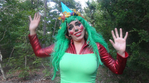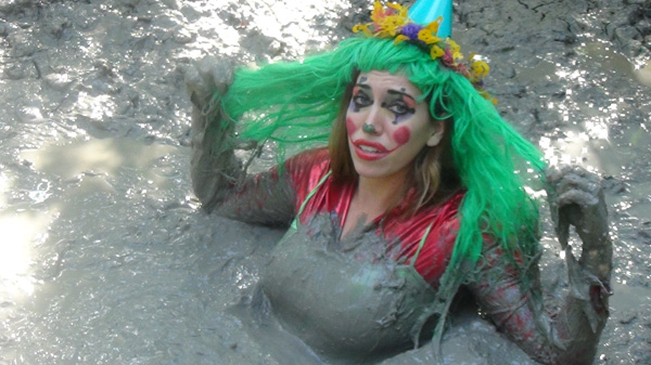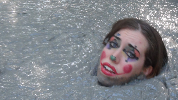 Not everyone likes clowns. In this scene Samantha is a clown. She encounters a person who hates clowns. She tries to cheer him up, which is what clowns are supposed to do. He plays along until they come to a pit of deep clay, at which point he pushes her in. As I said, he hates clowns.