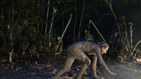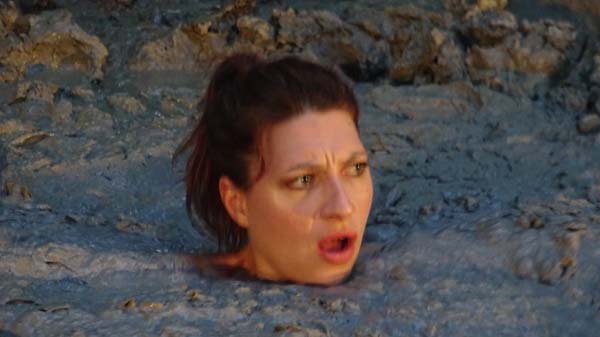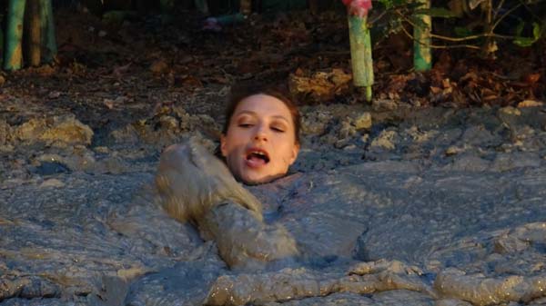 Chloe has to pass an initiation test in order to join the Touchtone Club, a service organization. She is told she must stay out in the forest all night, by herself, wearing nothing but a thong. Within seconds the skeeters arrive. She tries to keep them away by moving around. She moves faster and faster but they follow. Then she blunders straight into a pit of deep clay. She is panic stricken as she rapidly sinks to her neck. The fear is replaced by frustration when she stops sinking but is still stuck. Then she figures out how to move and crawls out. And then the bugs are back. She gets back in, realizing there is no danger and the bugs left her along in the mire. The rest of the scene is shear pleasure as she enjoys the mud all night, crawling out as the sun comes up.