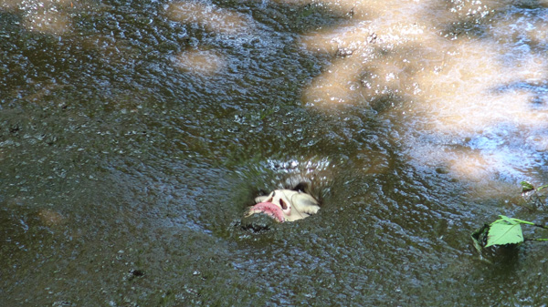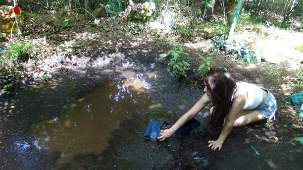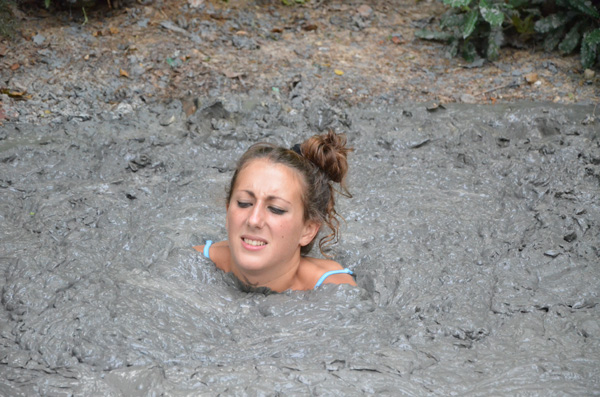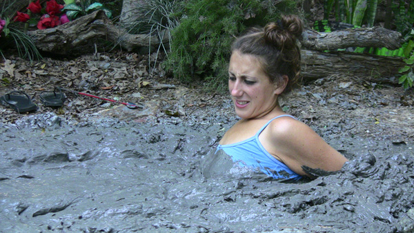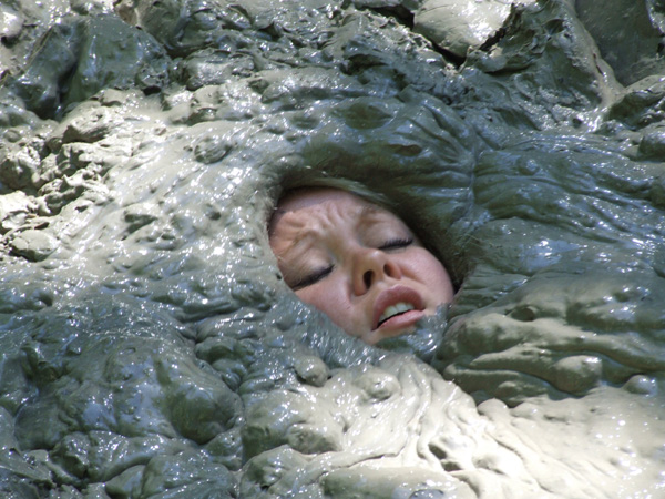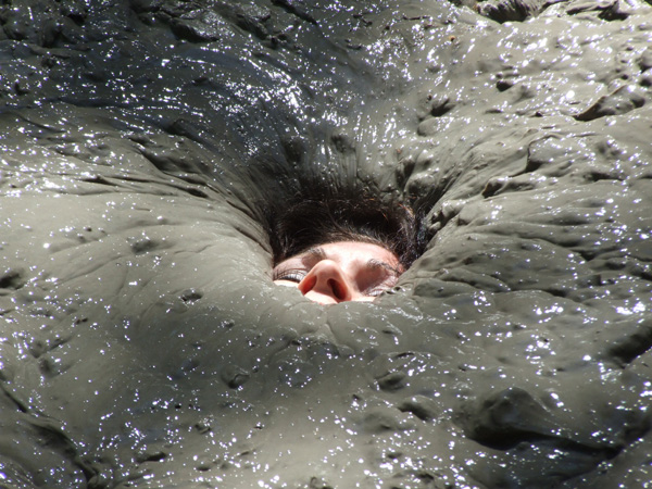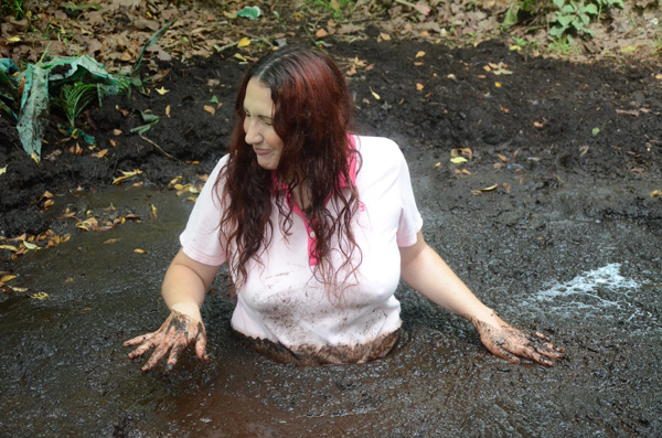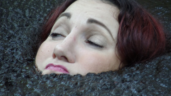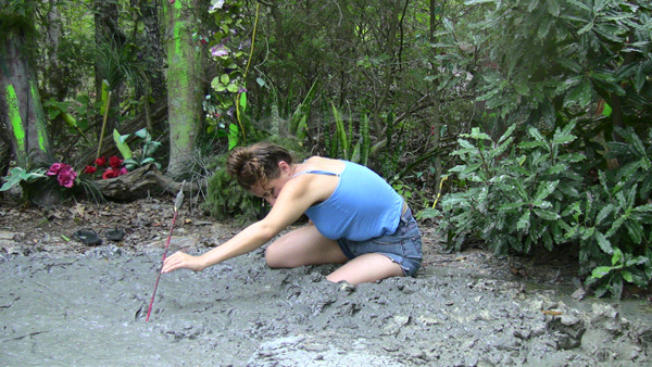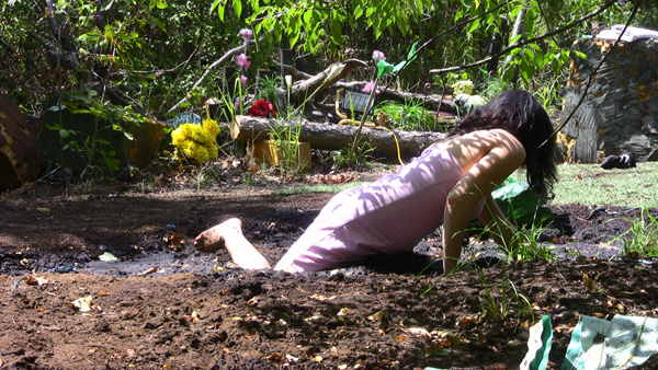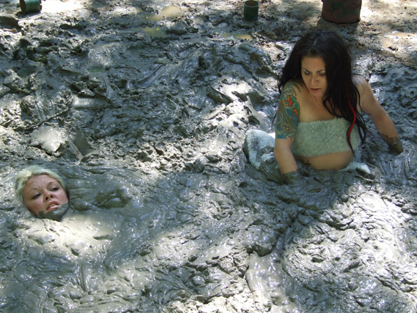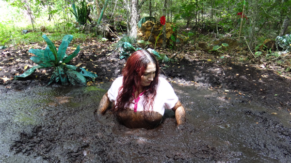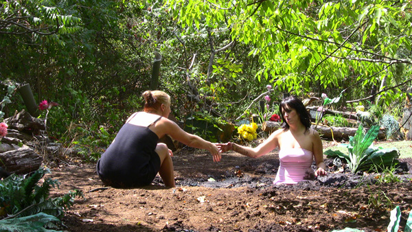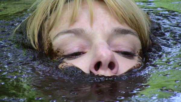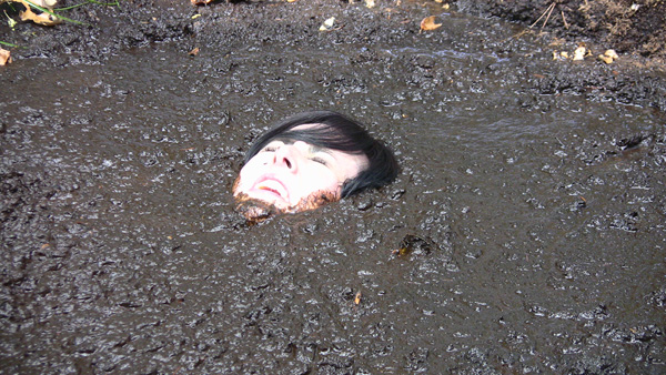 Angelique is doing research for a crime novel she is writing. The novel involves a victim encased in cement so she seeks out a mud pit to get an idea what it might feel like. In the end she gets hopelessly stuck and sinks under. This scene was also written and directed by Angelique herself.