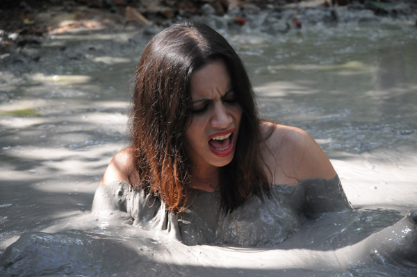 While driving along an unfamiliar rural gravel road, Elvira is extremely puzzled by a series of wardrobe malfunctions, especially when suddenly her top is entirely missing.... and then back. When she eventually figures out it is a dream she decides to take fulkl advantage, declaring that if she walks fifty steps into the forest she will find a quicksand pit. Sure enough, there it is at exactly fifty steps. From that point the scene is a lengthy, sexy wallow, including one orgasmic submergence, re-emergence, and crawl out.