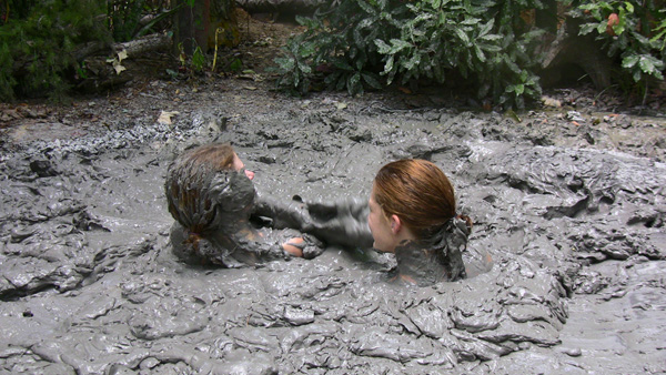 Stefani and Hannah have been rivals for years, over everything including husbands. They do not like each other much, to put it mildly. They encounter each other in the forest on the way to a soccer camp and the fireworks begin immediately. When Stefani swats Hannah's ball away it lands in a mud puddle. Things degenerate from there into even more of a catfight. At the end, after Hannah goes under Stefani laughs that she has finally won, even though she is already up to her chin. She goes under a few seconds later.