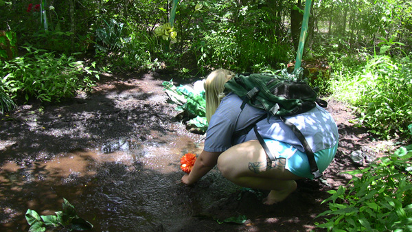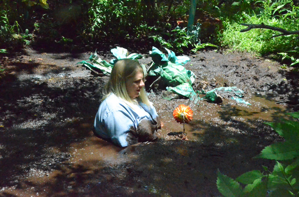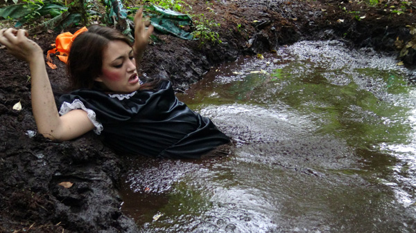 The scene begins with Stormy enjoying an afternoon hike. then she makes a comment to herself about how nothing can go wrong on such a perfect day. Not a good thing to say! Shortly after, she blunders into a pit of quicksand. After a good deal of struggle she is able to get out.... almost. But then her foot is seized by a hand emerging from underneath the mud and she is pulled back in. And under.