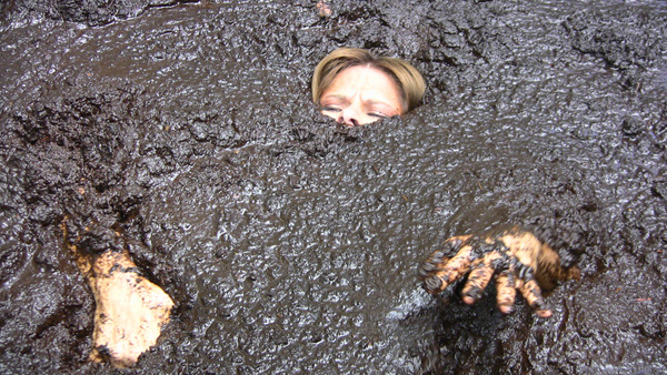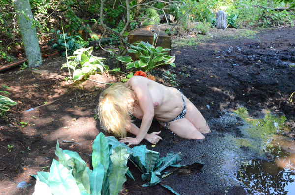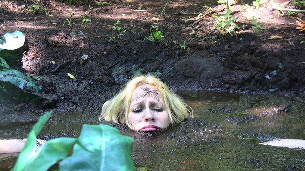 Jaded Dawn arrives at her favorite quick clay pit. There she rubs herself down with baby oil, first with her top on and then with it off. She then gets into the mud for a lengthy, sensuous wallow. At the end she crawls out toward a near ground-level camera. Very hot.