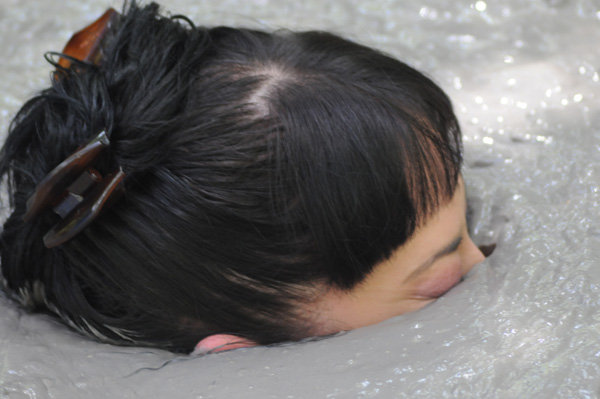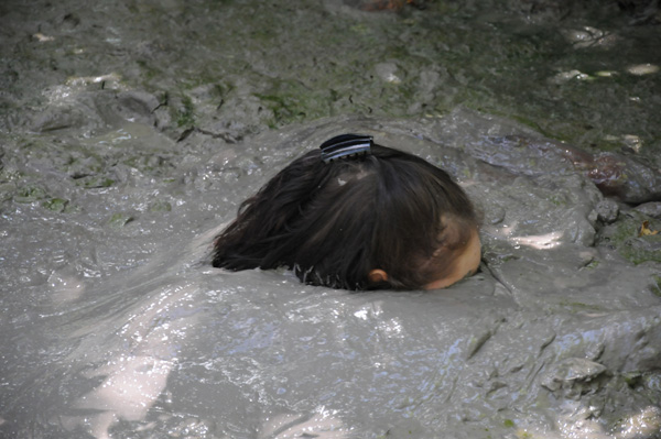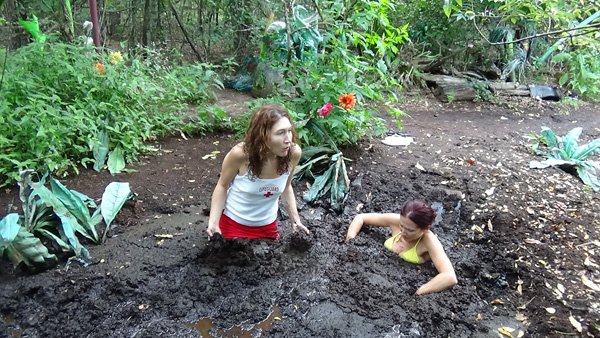 Stefani is a contestant on a 'reality' show where she is nearly naked and alone in the wilderness. Being pestered by biting insects she mentions to herself that it would be helpful to find some mud to coat her skin with as a bug repellent. Shortly after that she encounters a clay pit, but accidentally falls in. At first she is terrified as she rapidly sinks to her neck. The fear changes to frustration when she realizes she has stopped sinking but is stuck. Then she learns how to get in-stuck and crawls out. Then she gets back in when the bugs return. Things get better and better and she even submerges herself several times before eventually climbing out to find some food. Your videographer might actually watch if the TV game shows were like this scene - after all its Stefani!