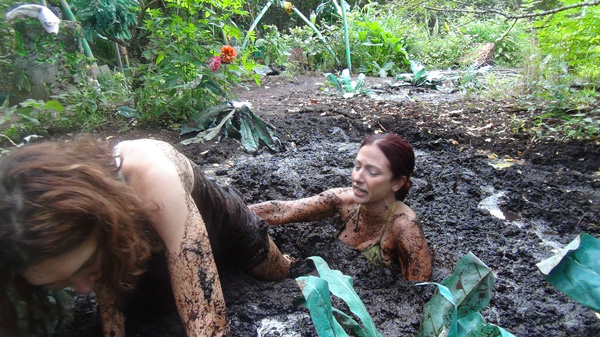 The tribe must have a new queen. Any woman may take the test and the first one to succeed inherits the throne. Nyssa is the first to make the attempt. She doesn't think much of the test, which is to enter a clay bog at one end and exit at the other. Nevertheless, she makes the attempt. She removes her shoes but not her dress and fails to make it. Stormy is next. She isn't too impressed by the test either but is smart enough to remove her dress before making the attempt. Stormy is now the queen. This scene features fairly lengthy sequences of both characters moving slowly toward the camera while quite deep.