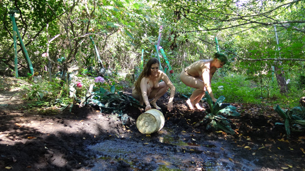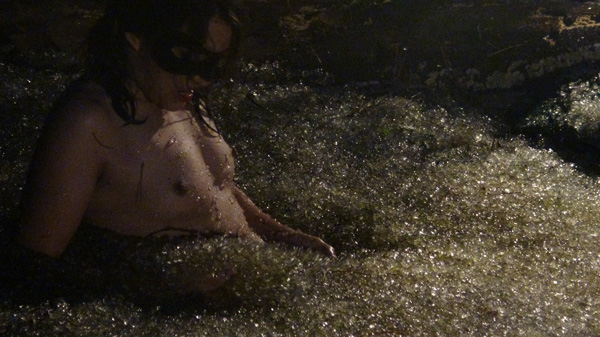 At 9:30 in the evening, a night scene starring Karma Ford as "Robyn" has just been completed. Karma crawls out and Fred hands her a cleanup hose. Karma tells Fred she does not need his help to clean up and she knows the way back. He has a lot of things still to do back at the house so he leaves her to clean up. As soon as she is sure he is gone, she strips off most of the costume except some bright red high boots and gets back in. She plays for quite a while, removing the boots part way through her wallow. Eventually Fred returns and asks if she is alright. She is embarrassed and starts to try to explain the she "fell in." Fred tells her there is no need to explain but he also tells her it is now 4:30AM. This one is pure Karma Ford.