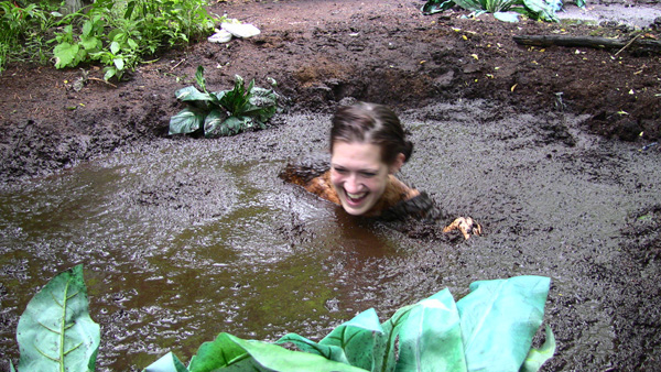 As the end of another successful shoot is celebrated over glasses of wine, Bella expresses her disappointment that the new pit was not quite ready and could not be used. After Fred agrees and expresses his own regret he calls it a night and goes to bed. Bella then decides she is NOT going to miss out on the new pit. What Fred doesn't know won't hurt him. She arrives with a towel and flashlight, strips to her bikini bottom, and gets in. She has quite a lengthy wallow, accompanied by a concert of tree frogs and other swamp night life and finds it quite stimulating. Toward the end the frog concert ends and after a few seconds it is apparent that a thunderstorm is approaching.