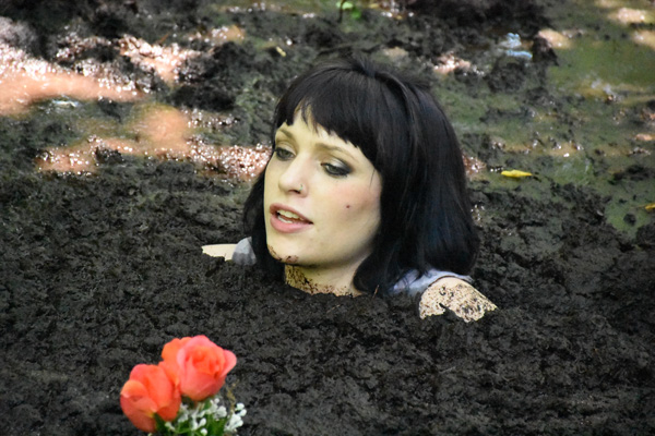 Misty has found out about a pit of some exotic quicksand-like substance on the land behind a factory and she is determined to try it out. The scene opens as Misty crawls under a wire fence just after dark. Then she finds the pit, which fortunately is not far from a security light that provides just enough light to see what she is doing. She gets in and has a lengthy sink, before eventually crawling out.