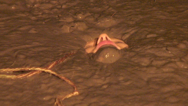 NormaGee wakes up to find herself with a rope around her chest and another rope to some overhead support. She is already chest deep in deep clay, although her exposed breasts are still above the surface. She goes through a variety of reactions, apparently having been drugged earlier. Eventually the rope breaks and she goes under, though in an aroused state. This scene was originally intended to be an episode of "Blowgun," but the initial blowgun attack was not filmed and the sinking begins further along than in the Blowgun series.