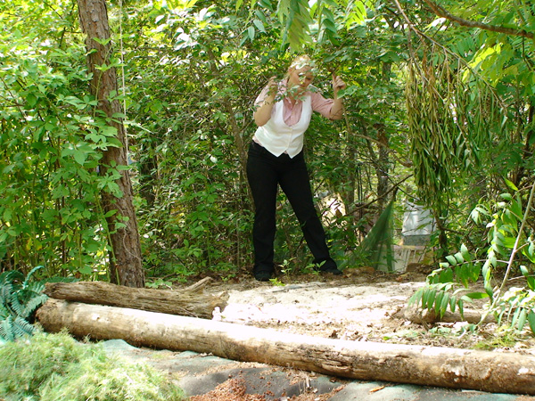 Karma plays a ditsy southern belle, dressed in a party dress from the 1840s. She heads out for a walk, demanding some pastry and a mint julip be ready when she returns. She nevr does return, of course, as quicksand intervenes. In the course of filming this scene we discovered that Karma is pretty good at doing a southern accent as well as playing a ditsy character.