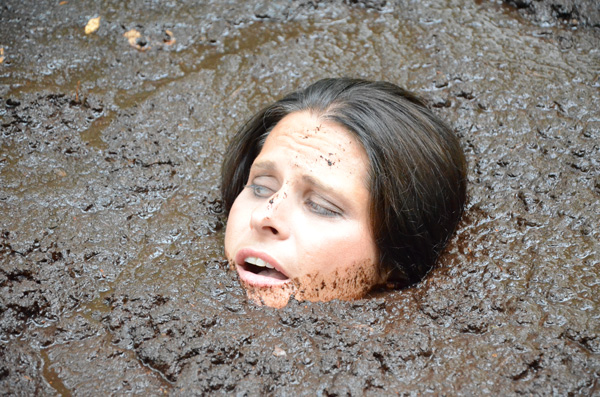 Bella performs a strip tease at the edge of a muddy spot in the forest. Then she complies with a request from her audience to enter the mud. That turns out to be a lot deeper than she though and she is soon stuck. With increasing panic she pleads for help as she slowly but steadily sinks. She goes all he way under, but then pops back up and crawls out.