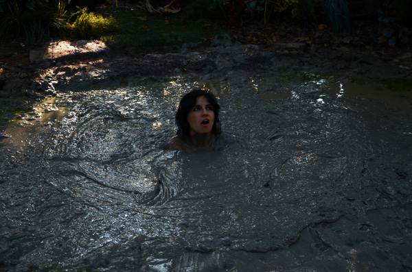 Bob and Magenta play a pair of extra-terrestrials who have beamed down to Earth for their vacation. While they look like human beings one key difference is their taste buds are in their feet and chests. On a previous visit, Bob got into a some serious trouble in a pizza restaurant for trying to taste the pizza with her feet. With their sandals oft they find many places on the ground that are delicious. Looking around they come to a wet spot. It tastes delicious; so good, in fact that they take off their tops and get in to get the full flavor of the rather deep mud. Gradually they sink deeper and deeper and are so overwhelmed they quite happily go al the way under.