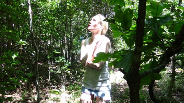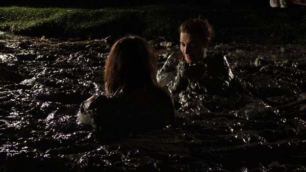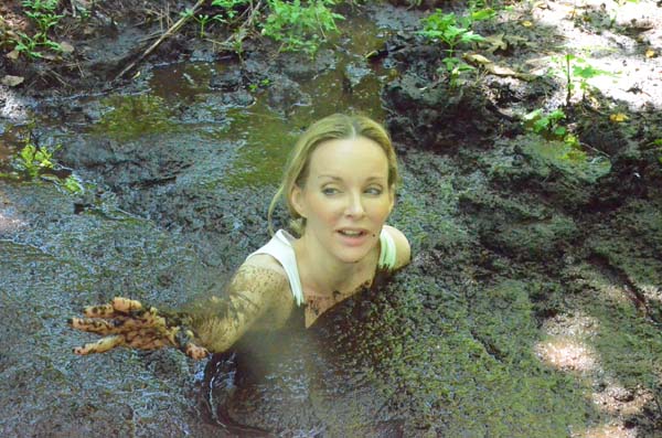 Hannah is in the swamp at night with a bucket, collecting edible bullfrogs. Unfortunately for here she accidentally slips into the bog. Is this the "revenge of the bullfrogs"?
