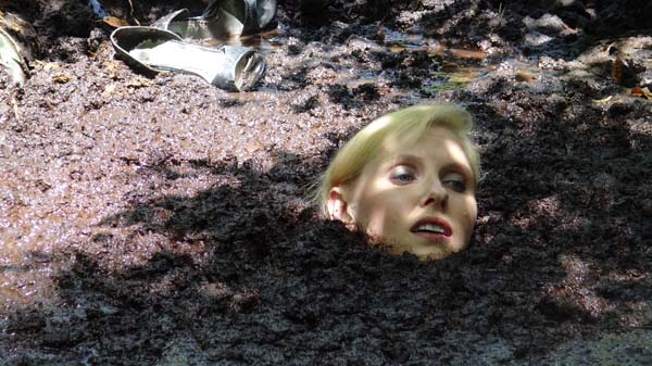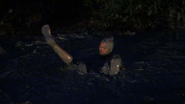 To become a member of the Touchtone Club, Kennedy must undergo an initiation designed to test her ability to face unexpected challenges. She must stay out in the forest by herself, all night, nearly naked. There are mosquitos so she tries to walk around to crate a breeze to keep them off. That fails so she walks faster as it gets dark. Suddenly she blunders into a pit of quicksand. In a panic she siks rapidly to her neck. The panic then becomes frustration as she stops sinking but is stuck. She figures out how to move and crawls out. Now the skeeters are back. Realizing they left her alone in the bog she gets back in. The rest of the scene is an all-night pleasure wallow.