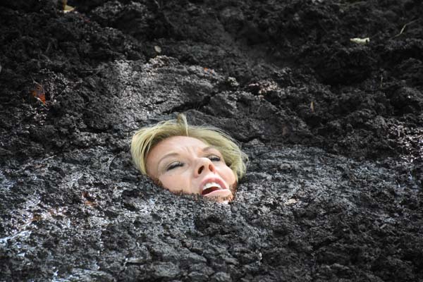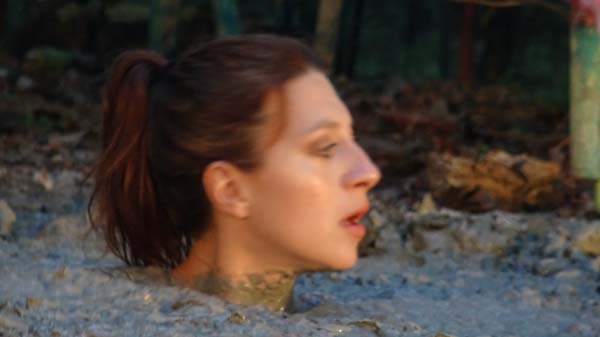 Chloe has to pass an initiation test in order to join the Touchtone Club, a service organization. She is told she must stay out in the forest all night, by herself, wearing nothing but a thong. Within seconds the skeeters arrive. She tries to keep them away by moving around. She moves faster and faster but they follow. Then she blunders straight into a pit of deep clay. She is panic stricken as she rapidly sinks to her neck. The fear is replaced by frustration when she stops sinking but is still stuck. Then she figures out how to move and crawls out. And then the bugs are back. She gets back in, realizing there is no danger and the bugs left her along in the mire. The rest of the scene is shear pleasure as she enjoys the mud all night, crawling out as the sun comes up.