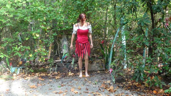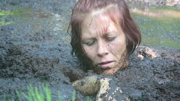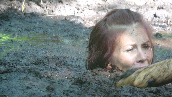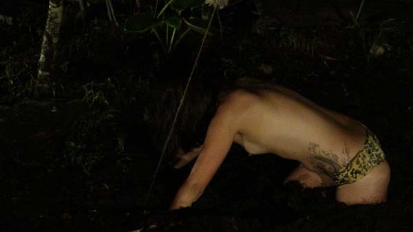 To become a full member of the tribe, Karma must survive a life threatening challenge. She first renders herself unconscious using a small dart coated with painful ant venon. When she awakens she finds herself suspended by a vine with her feet on the surface of a bog.