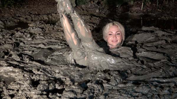 As this one opens, Bella is cleaning up after the last scene of a two-day shoot. It is about 9PM. As she can handle the cleanup by herself and knows the way back to headquarters, even though it is now dark, Fred takes the cameras back to headquarters to begin offloading and wrapping up the shoot. After making sure he has gone, Bella gets back into the mud for just a little more. She has a very enjoyable wallow. Finally, she is startled as Fred returns to ask if she is alright. "I fell in," she tries to explain rather sheepishly. She then really turns red when Fred asks if she realizes it is now four o'clock in the morning.