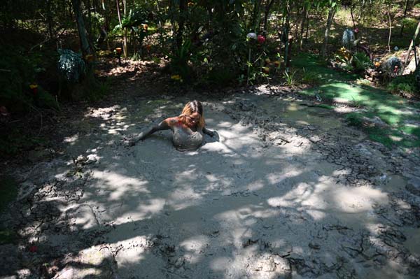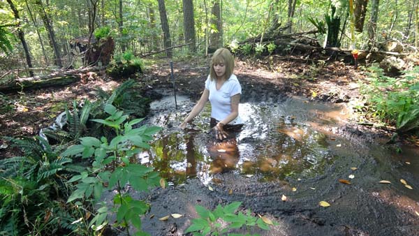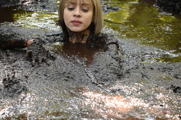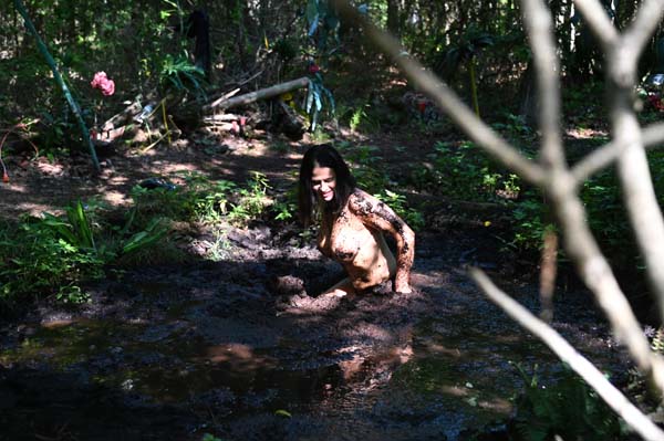 To become a member of the Touchtone Club, rose must go through an initiation ritual. She must stay out all night in the forest, alone, and almost naked. Immediately the mosquitos attack. She tries to keep moving...faster and faster, but they keep it up. Then, going too fast in the gathering darkness she blunders into quicksand. She sinks to her neck in panic. The panic turns to frustration as she stops sinking but is still stuck. Then, figuring out how to move in the thick clay she crawls out. The mosquitoes return. Well they left her alone in the more so she gets back in and has a nice wallow all night.
