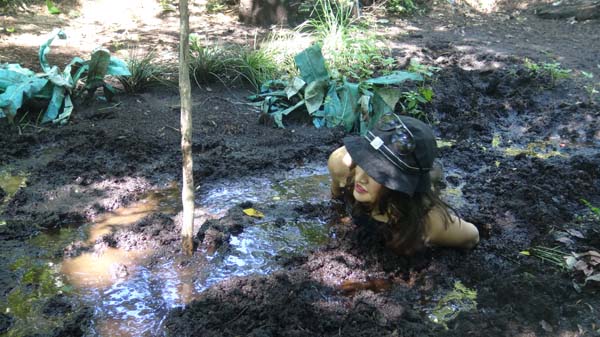 Karma tries to cross a muddy area but falls in. She has quite a struggle but eventually is able to slog all the way to the far side.