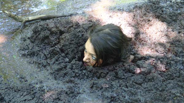 Haylie has become concerned about illegal aliens sneeking into the country across the Canadian border. She has constructed a large mud pit to stop intruders and guards it, armed with a gun. Suddenly she thinks she hears someone approaching. Most likely it is a moose but she fires in it's direction. The recoil from her gun causes her to lose her balance and she falls backwards into her own mud pit. Oops!