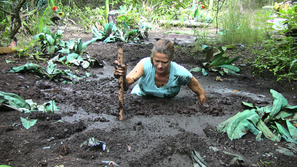 The scene starts out with Stefani in the kitchen doing some dishes. There is a disturbance on the porch outside. She investigates and its those peky raccoons again. He's had enough of them and goes after them with a two by four. She follows them for a while (there is actually footage of a raccoon scampering away) but they lead her right into the peat bog.