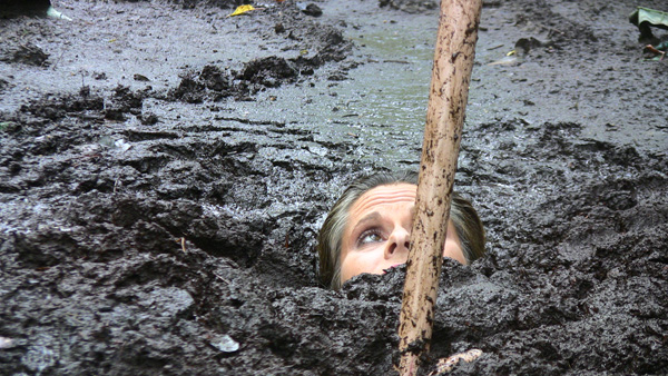 Savannah is sleepinig in her car. She wakes up, or thinks she has awakened, to hear footsteps outside. She gets out to investigate, turns around and her car is gone. She starts hearing wild animals, its getting dark, a thinderstorm is starting. She panics. She is in quicksand. The quicksand bubbles, more animal sounds, the storm gets worse, there is a snake in the mud itself. Arrows land very close. She goes under.