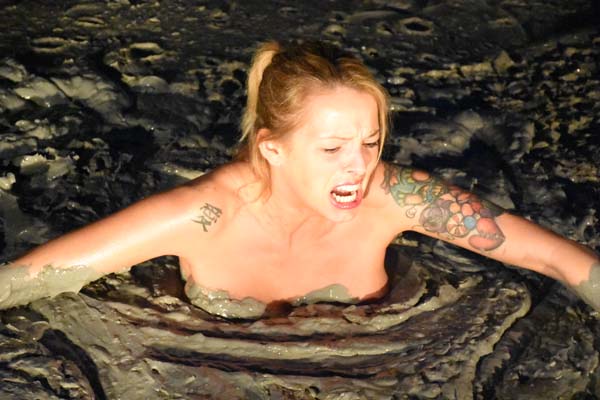 Having gotten so drunk at the Sucking Toad Bar, Grill, and Troublespot that they have taken away her keys, Bella tries to walk home using the shortcut through the forest. Unfortunately for her there is a quicksand pit in the way.