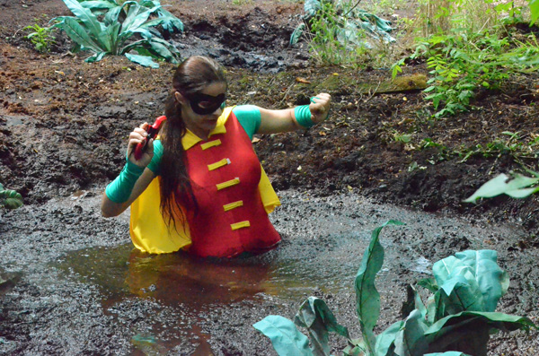 Robyn is searching for her utility belt. She spots it but its on the far side of a peat bog, which she does not recognize, so she is soon stuck and sinking. She manages to use other tools to eventually snag the utility belt and uses the boomerang in that to snag a branch, which she uses to eventually escape. Superhero costume fans should really like this one.