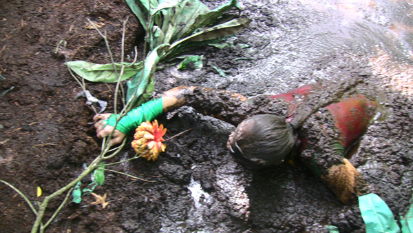 This scene is rather unique in several ways. Rachelle actually plays two roles, one as the victim of some sort of sadistic experiment and the other as the voice of the protagonist. As the victim, Rachelle is running from something unknown to her, stripped to the waist, and with her hands bound. Coming upon a pit of clay mud she tries to use it to hide, but in the end it takes her under. Rachelle does not speak in this role. As the protagonist, she plays almost monotone voice of some sort of monster, perhaps an insane scientist, directing the experiment as if her subject (subject 77-A) was a laboratory rat. This is a true horror tale. Here are some sample stills but stills cannot really convey what this scene is.
