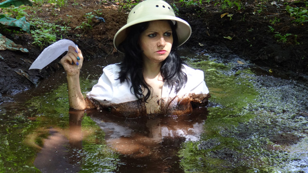 This scene starts with Hannah as a jungle explorer, trying to follow a map. She is dressed in traditional jungle explorer style including pith helmet. The maps leads her to blunder into a bog (peat). She sinks slowly but steadily, eventually going completely under. The helmet stays on as she submerges, also going under.