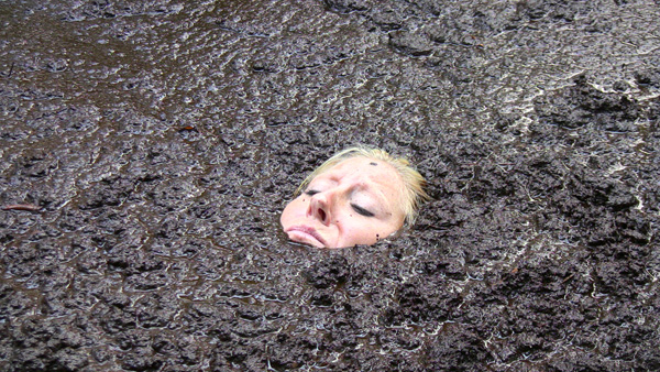 Angelique is doing research for a crime novel she is writing. The novel involves a victim encased in cement so she seeks out a mud pit to get an idea what it might feel like. In the end she gets hopelessly stuck and sinks under. This scene was also written and directed by Angelique herself.